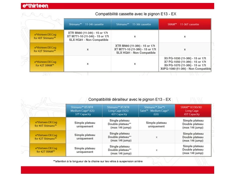 Le pignon 42 dents E Thirteen EX Cog vous permet de bénéficier des nouveaux rapports de transmission utilisés sur les groupes 1X11 vitesses XX1 et X01 sans avoir à tout changer. Il vous suffit de monter ce pignon derrière celui de 36 dents de votre cassette XT ou XTR 10 vitesses, d’oter le pignon de 15 ou 17, et de refaire votre réglage de dérailleur avec la vis de tension fournie et vous voilà avec une transmission prête à faire parler la poudre !