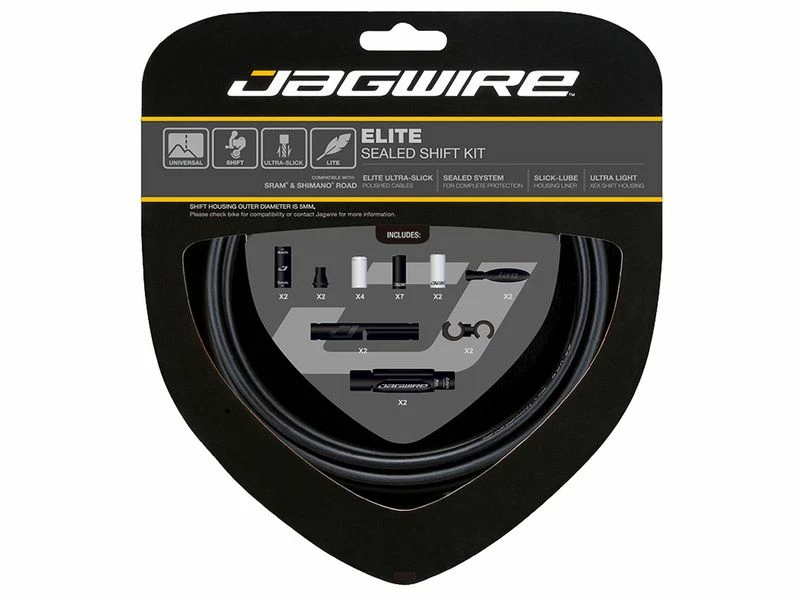 Le kit câbles et gaines de dérailleur Jagwire Universal Elite Sealed utilise un nouveau liner Slick Lube combiné à des joints protègeant ainsi totalement le système contre la terre, la boue et autres débris. La lubrification basse friction offre d’excellentes performances et une grande durabilité quelques soient les conditions météo