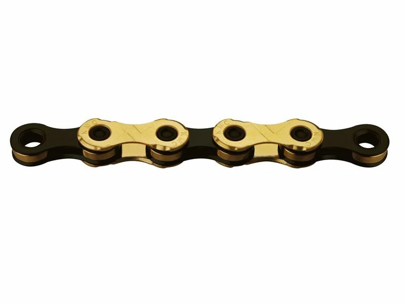 La chaine KMC X12 Ti-N 12 vitesses noir et or est compatible avec les transmissions Shimano et Sram VTT et est annoncée comme plus durable comparé aux chaines de gamme équivalente. Elle est composée de 126 maillons tous plein pour une rigidité optimale, et ils sont tous traités avec le revêtement Titanium Nitride pour une résistance à l’usure maximale. Elle est livrée avec un maillon rapide non réutilisable.