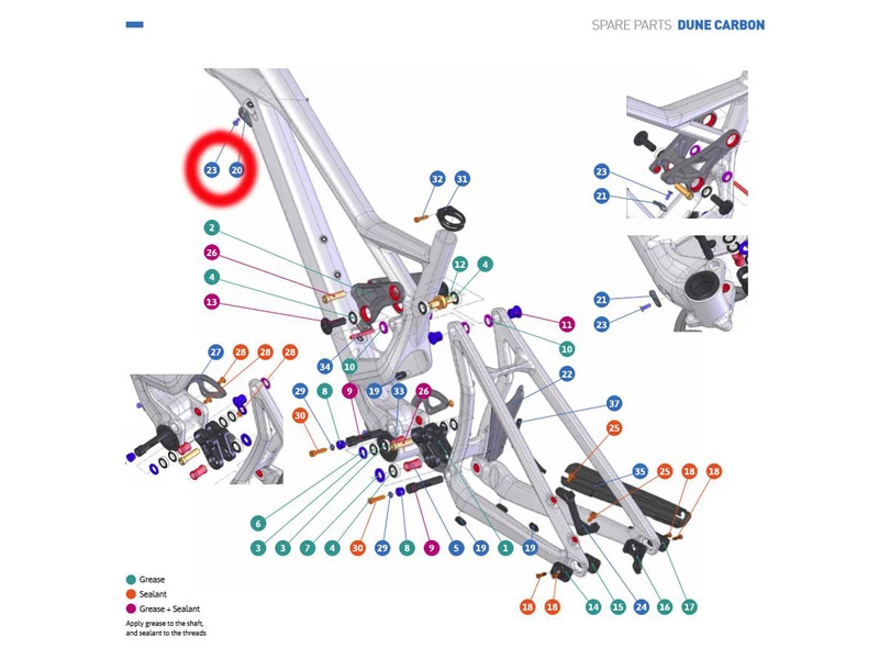 Le guide gaine supérieur Mondraker pour cadre Dune Carbone sert à bloquer la gaine à son entrée dans le cadre. Voir éclaté.